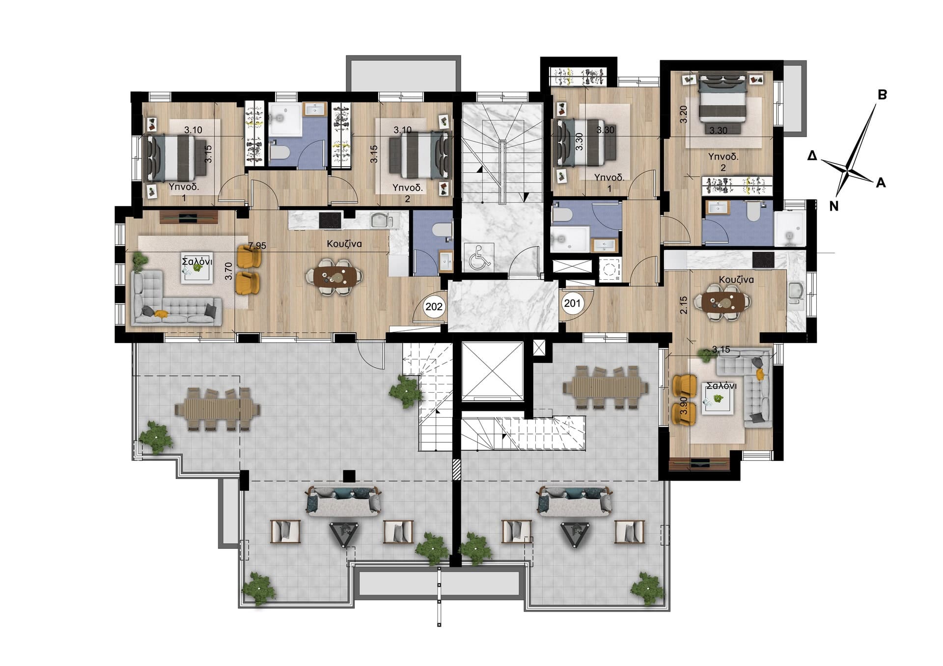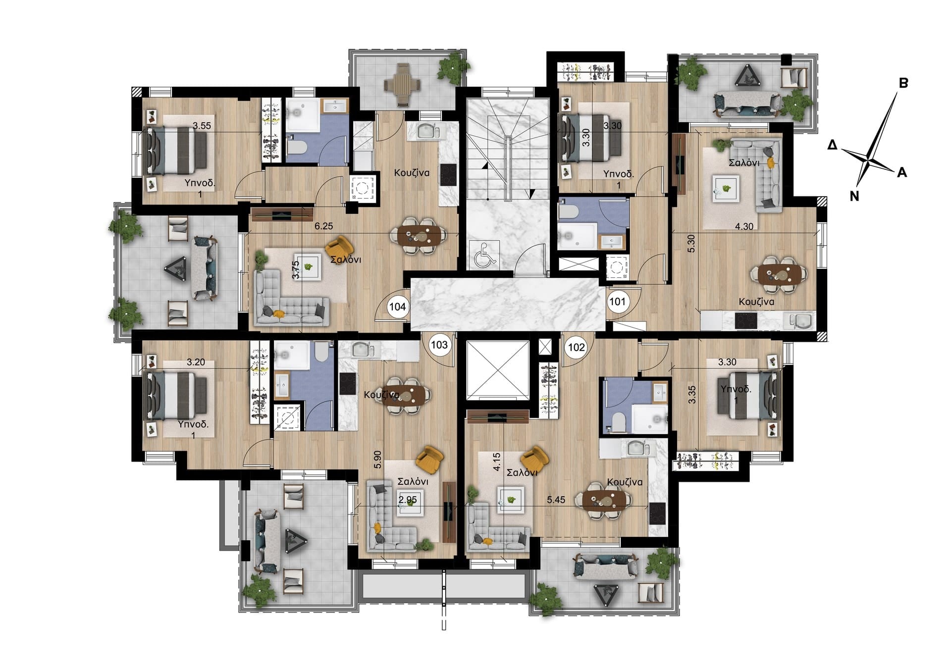 – On the first floor, there are four one-bedroom apartments.