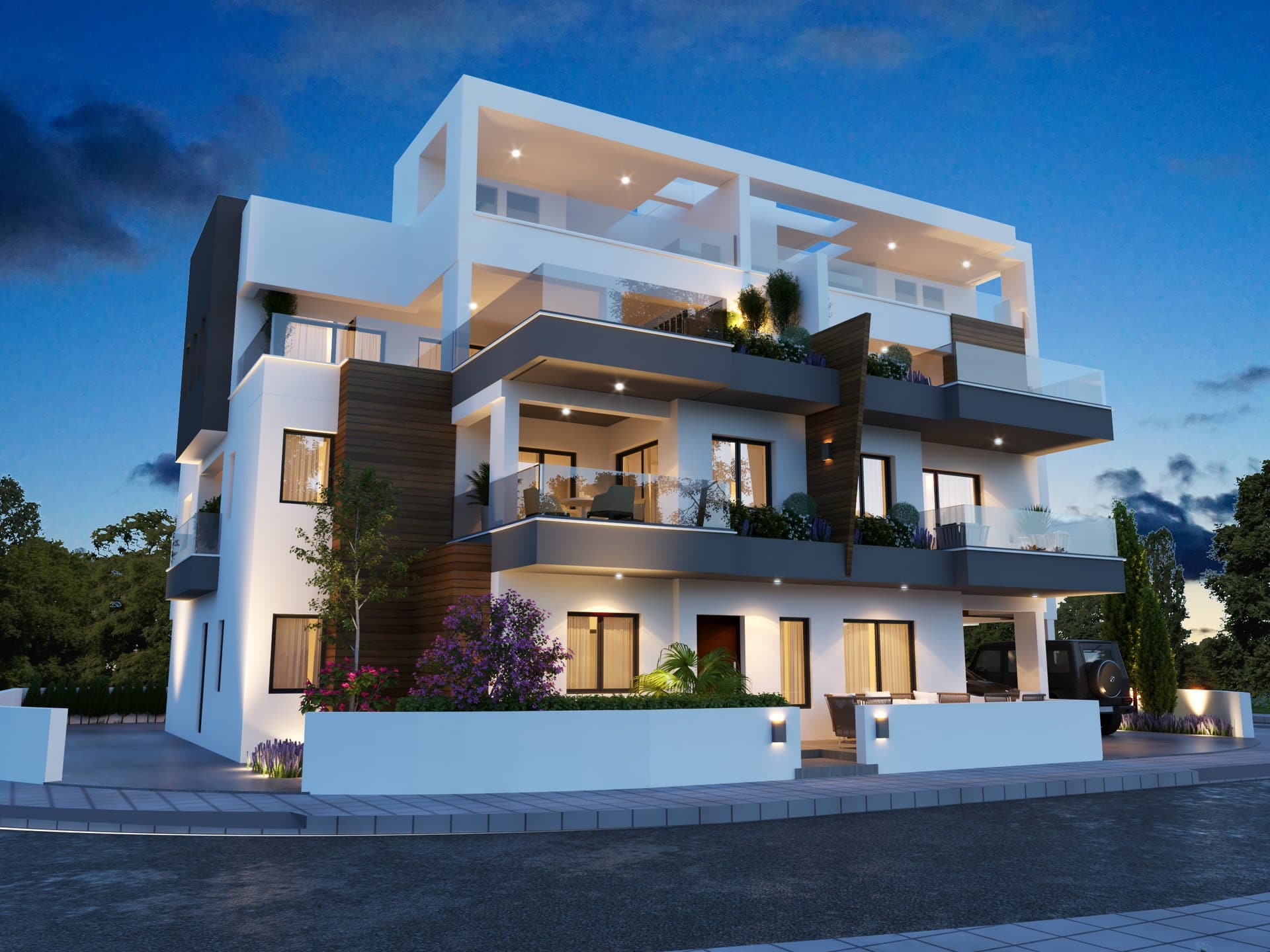 – On the second floor, there are two two-bedroom apartments with large verandas and private stairs leading to a Roof Garden.
